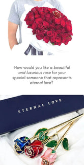 With superior craftsmanship, our Eternal Love collection is made entirely out of real rose stem and petals. Lined and plated with 24K Gold, this rose is a beautiful gift for your loved ones that signifies your eternal love!